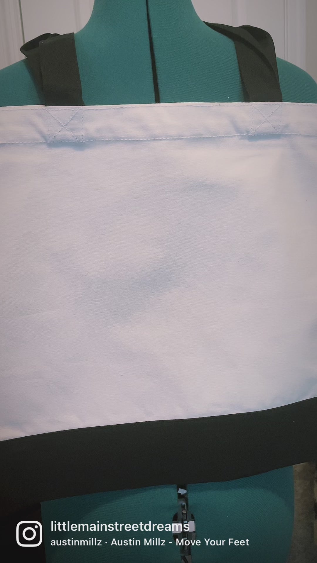 100% cotton canvas, 15‘’W X 16’’H, handles long enough to be carried by hand and on shoulder.